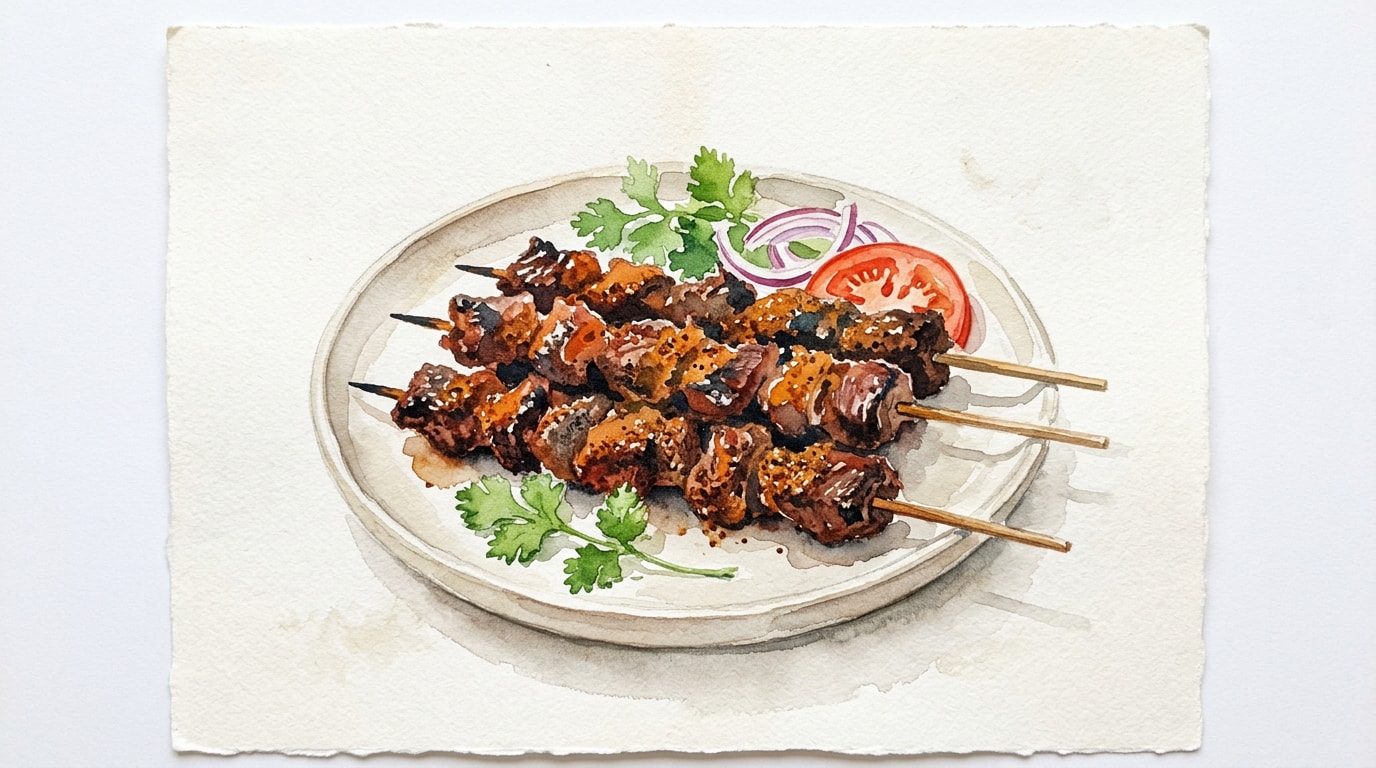 Thread the spiced beef onto the soaked skewers, weaving the meat back and forth like a ribbon to expose maximum surface area. Place the skewers on a tray, cover, and refrigerate for 1 hour.