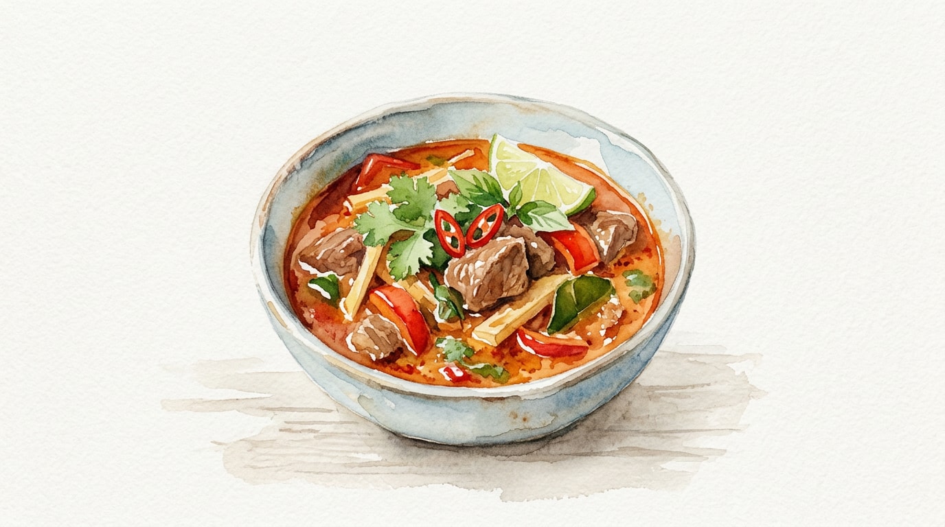 Once the beef is tender, stir in the sliced bamboo shoots, palm sugar, fish sauce, and torn makrut lime leaves. Simmer for an additional 5 minutes to heat the bamboo shoots and meld the flavors.