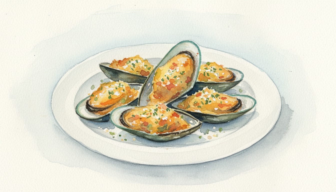 Arrange the mussels on the half-shell on a baking sheet. Spoon roughly 1 teaspoon of the butter mixture onto each mussel, pressing gently to adhere.
