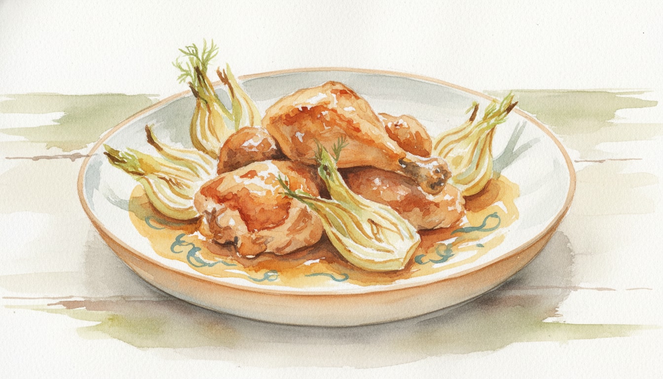 Reduce heat to medium (160°C/320°F). Add the sliced fennel bulb and onion to the rendered chicken fat. Sauté for 8-10 minutes, stirring occasionally, until softened and caramelized around the edges.