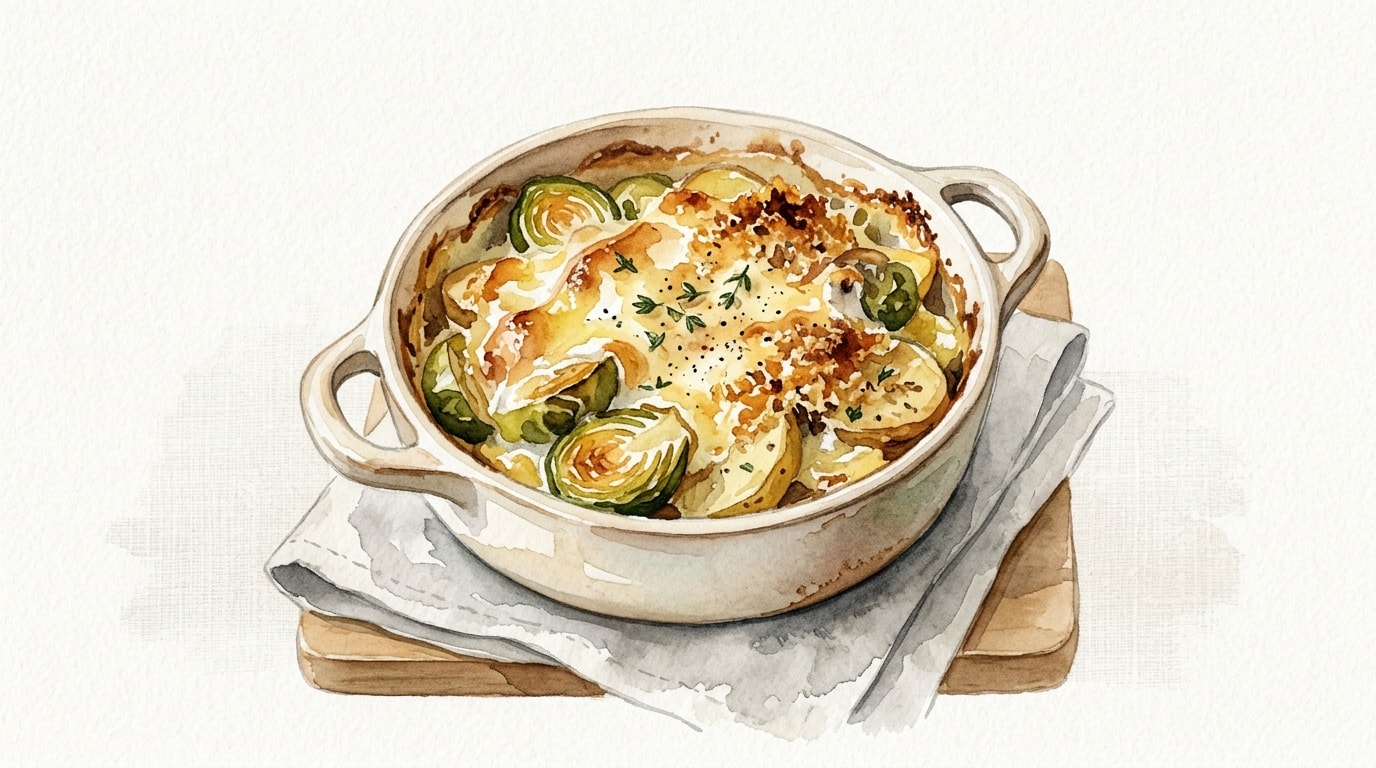 Layer half of the sliced potatoes evenly in the bottom of the prepared gratin dish. Scatter the caramelized Brussels sprouts and half of the cubed Taleggio over the potatoes.