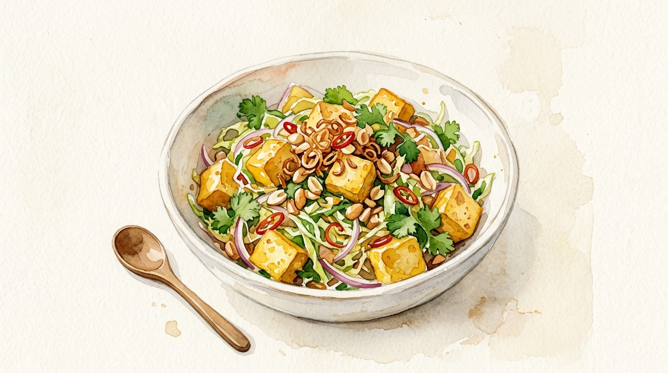 Turn the set chickpea tofu out onto a cutting board. Slice into bite-sized cubes or thick strips. Gently toss the tofu with the tamarind dressing. Plate the salad and garnish generously with the crispy shallots and fried garlic.