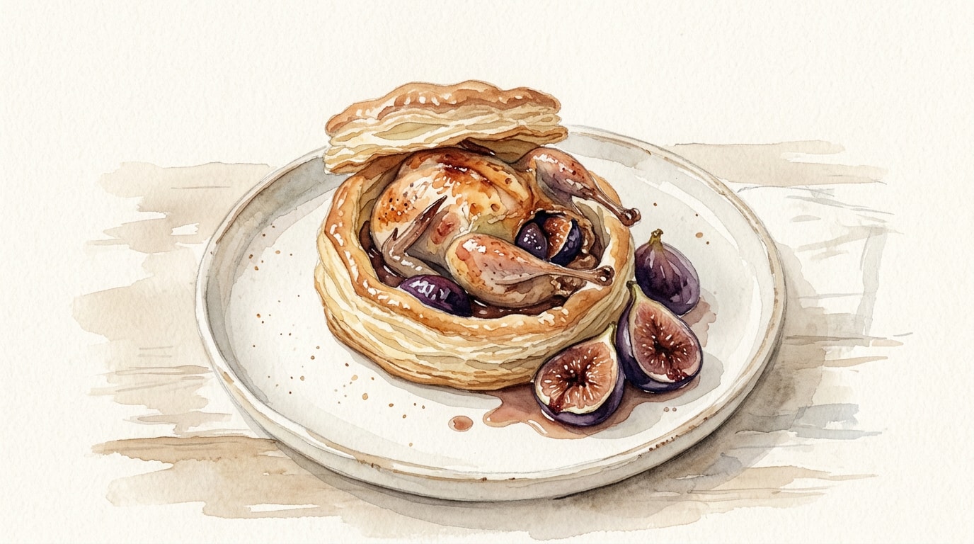 Plate each quail sarcophagus in the center of a warm plate and spoon the rich fig sauce generously around the base.