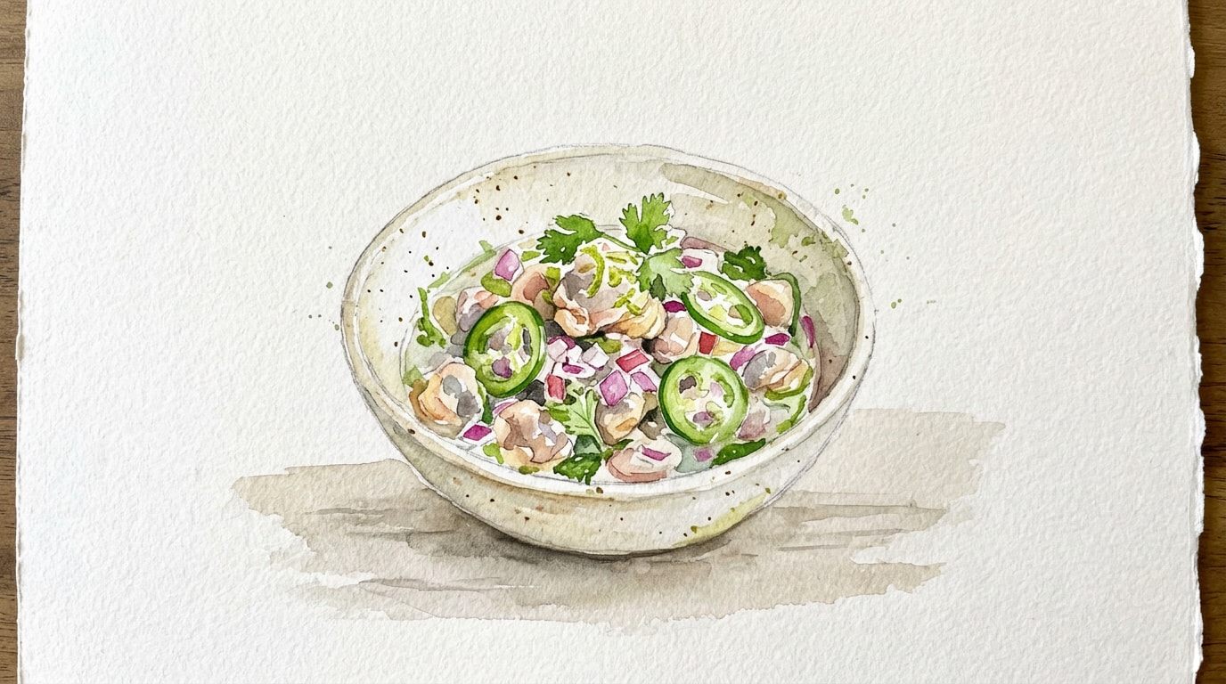 In a non-reactive glass or ceramic mixing bowl, combine the diced clam meat, thinly sliced red onion, and finely diced jalapeno. Pour the freshly squeezed lime juice over the mixture.