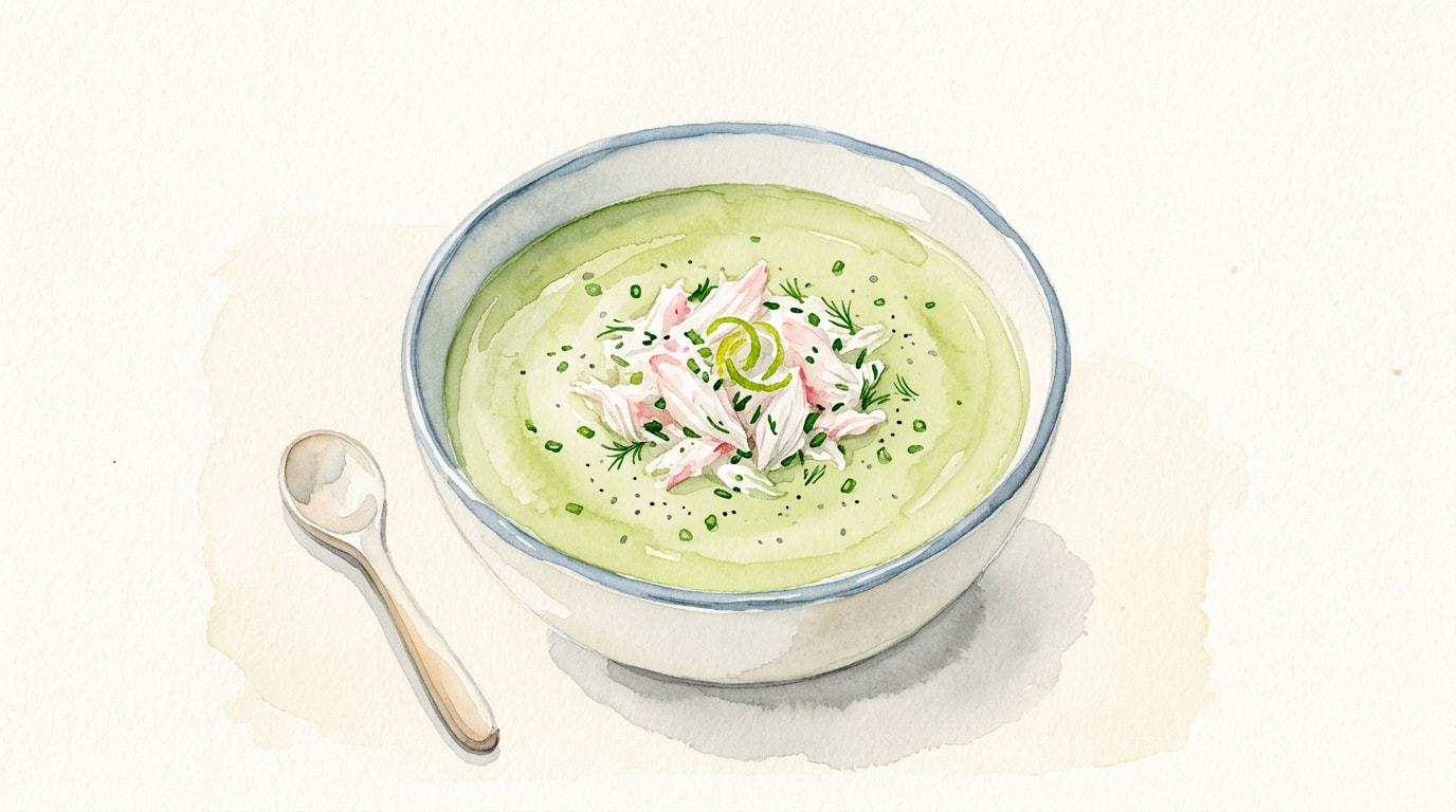 Ladle the fully chilled avocado soup into cold serving bowls. Mound a generous, neat portion of the crab salad directly in the center of each bowl. Serve immediately while frosty and crisp.