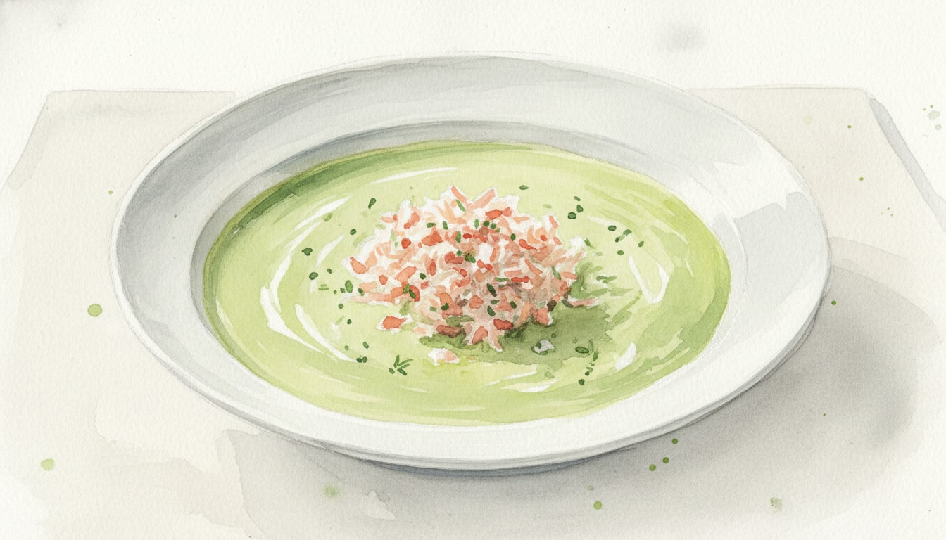 Ladle the chilled soup into chilled shallow bowls. Place a neat mound of the crab salad in the center of each bowl. Garnish with flaky sea salt and a few drops of olive oil.
