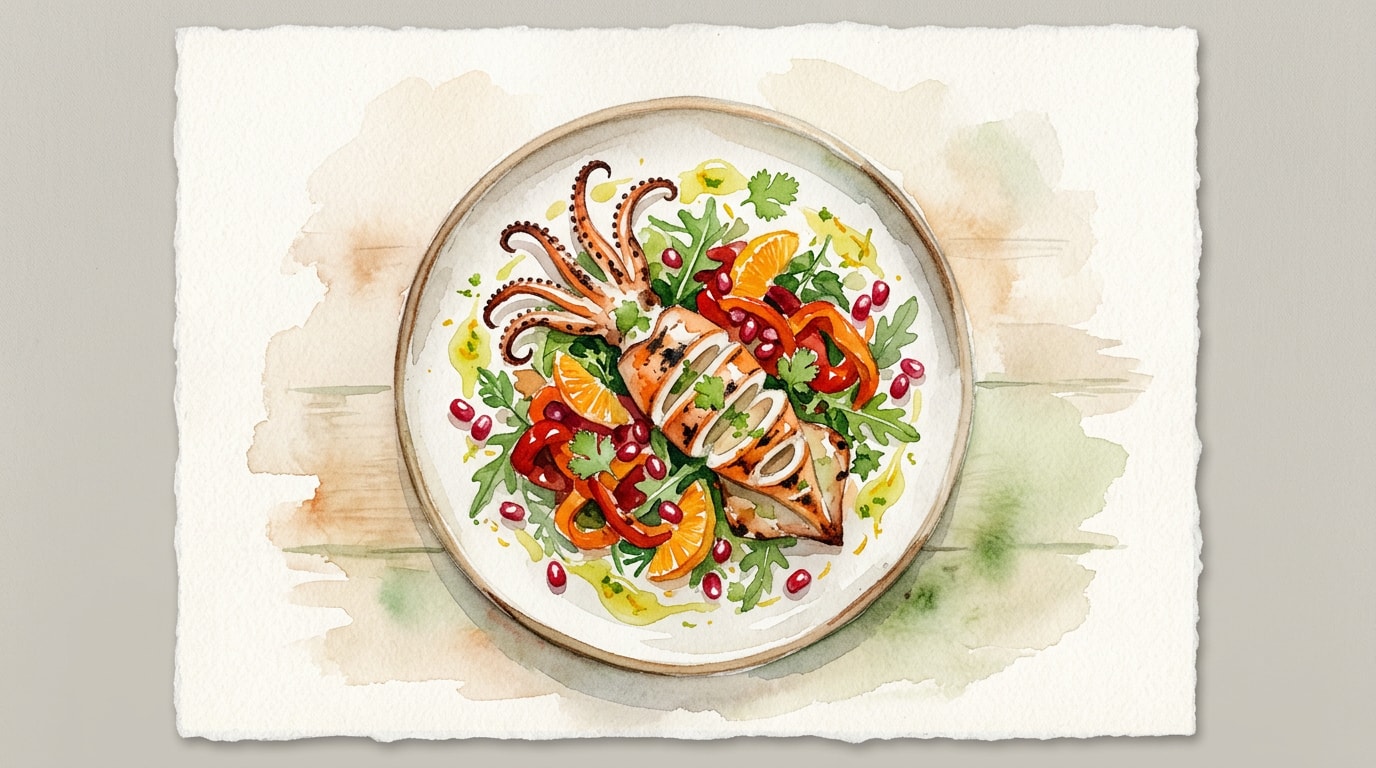 Garnish the platter generously with pomegranate seeds, fresh cilantro, and chervil. Serve immediately while the squid is hot and the salad is room temperature.