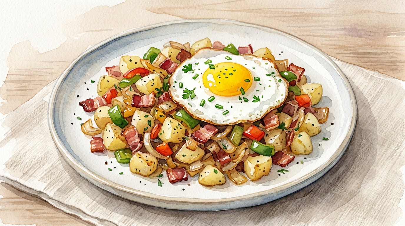 - For those who eat eggs, creating small wells in the finished hash and cracking an egg into each, then covering the pan until the whites are set, transforms this into a complete one-skillet breakfast meal.