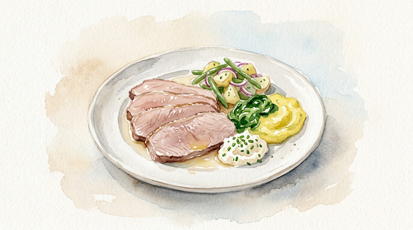 Plate the warm beef slices with a ladle of hot strained broth poured over top to keep them moist. Serve immediately with the boiled vegetables arranged alongside, and offer the Apfelkren and Schnittlauchsauce in chilled ramekins.