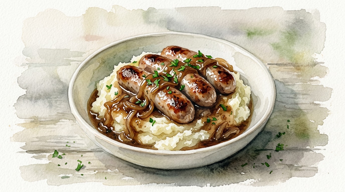 Divide the creamy mashed potatoes among four plates. Place two sausages atop each mound of mash, then generously ladle the rich onion gravy over the entire dish. Serve immediately.
