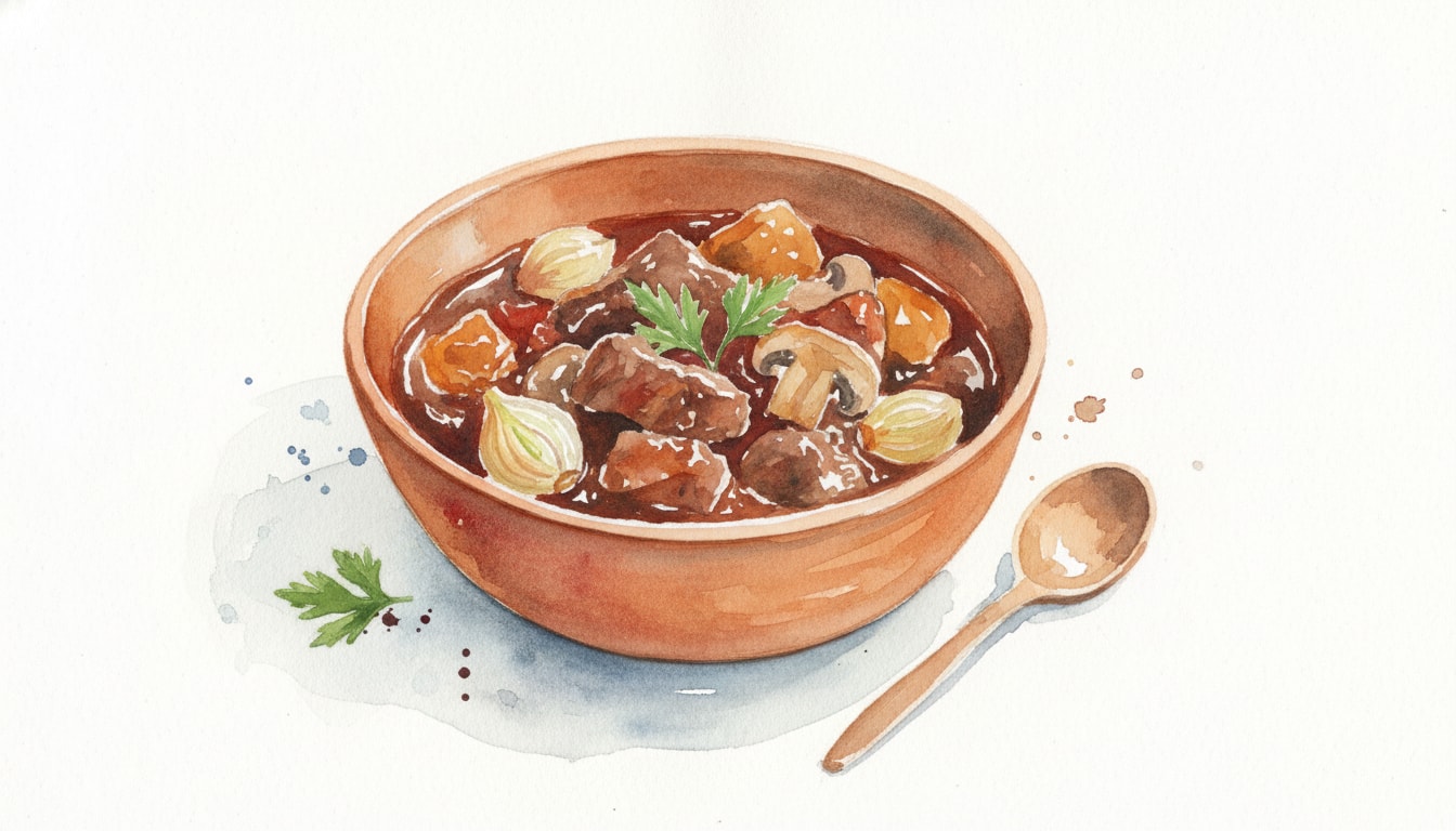 While the stew braises, prepare the garnish. In a separate skillet, heat the butter over medium heat. Sauté the pearl onions and mushrooms until browned and tender, about 10 minutes. Set aside.