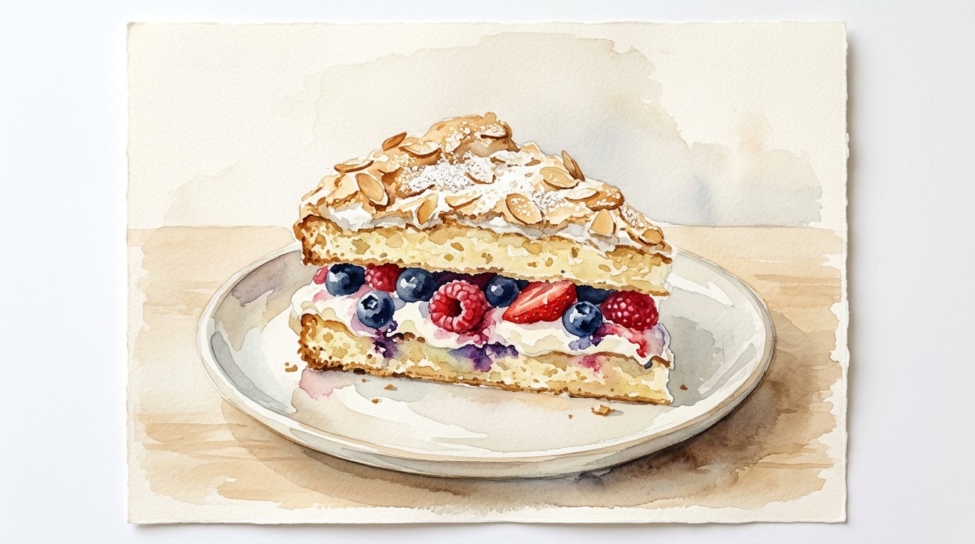 Place one cake layer onto a serving platter, meringue side facing up. Spread the whipped cream evenly over the meringue. Scatter the fresh raspberries over the cream, pressing them slightly into it. Top with the second cake layer, meringue side up.