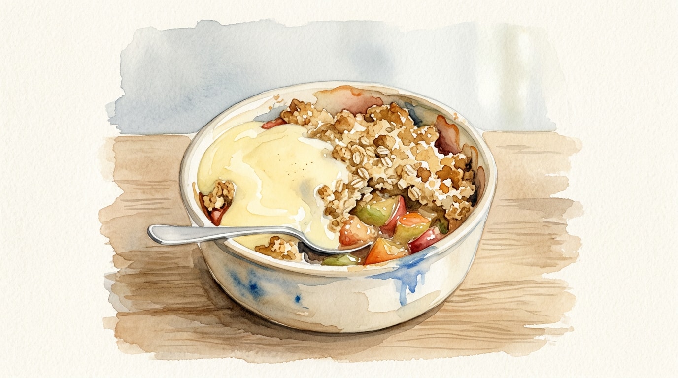 Serve the apple crumble warm in bowls, pouring a generous ladle of the hot vanilla custard over the crispy topping.