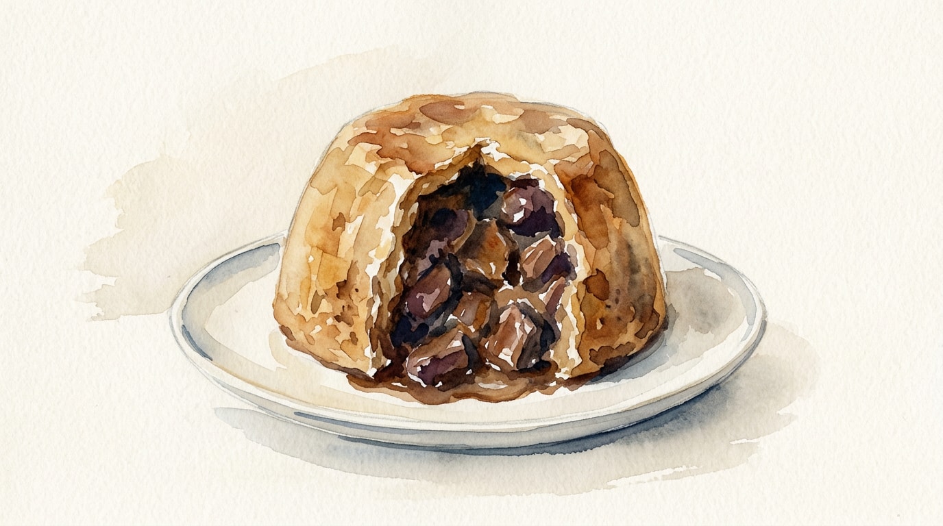 Using the string handle, carefully lift the pudding from the pot. Let it rest for 10 minutes before removing the string, foil, and parchment. Serve directly from the basin by scooping through the crust to reveal the filling.