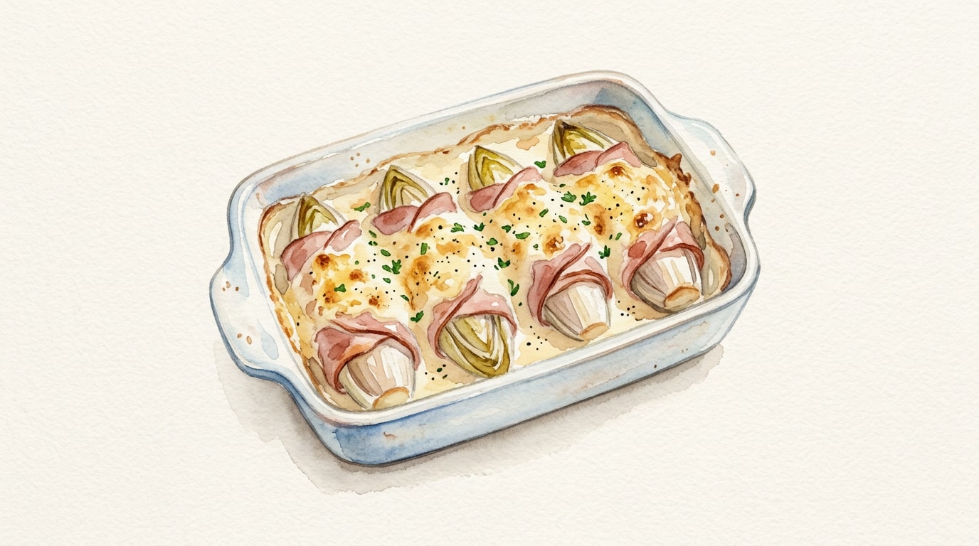 Wrap each squeezed, drained endive snugly in a slice of cooked ham. Arrange the wrapped parcels seam-side down in a single layer inside a gratin dish.