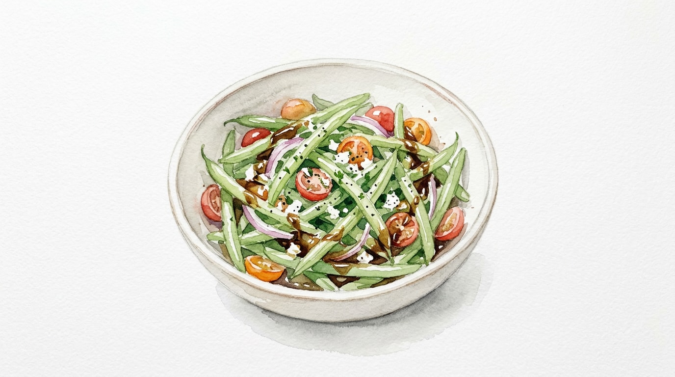 Place the dried green beans and thinly sliced red onions in a serving bowl. Pour the vinaigrette over the top and toss thoroughly to coat. Let the salad rest for 15 minutes before serving to allow the flavors to meld.