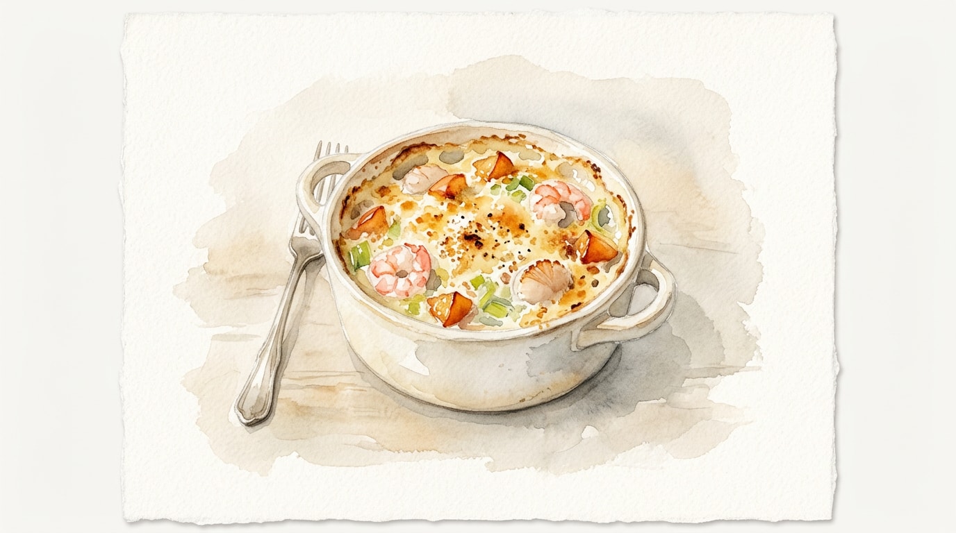 Preheat your oven to 200C/400F. Generously butter a 1.5-litre gratin dish or 9x9 inch baking dish. Ensure all fish and prawns are patted completely dry with paper towels to prevent a watery sauce.