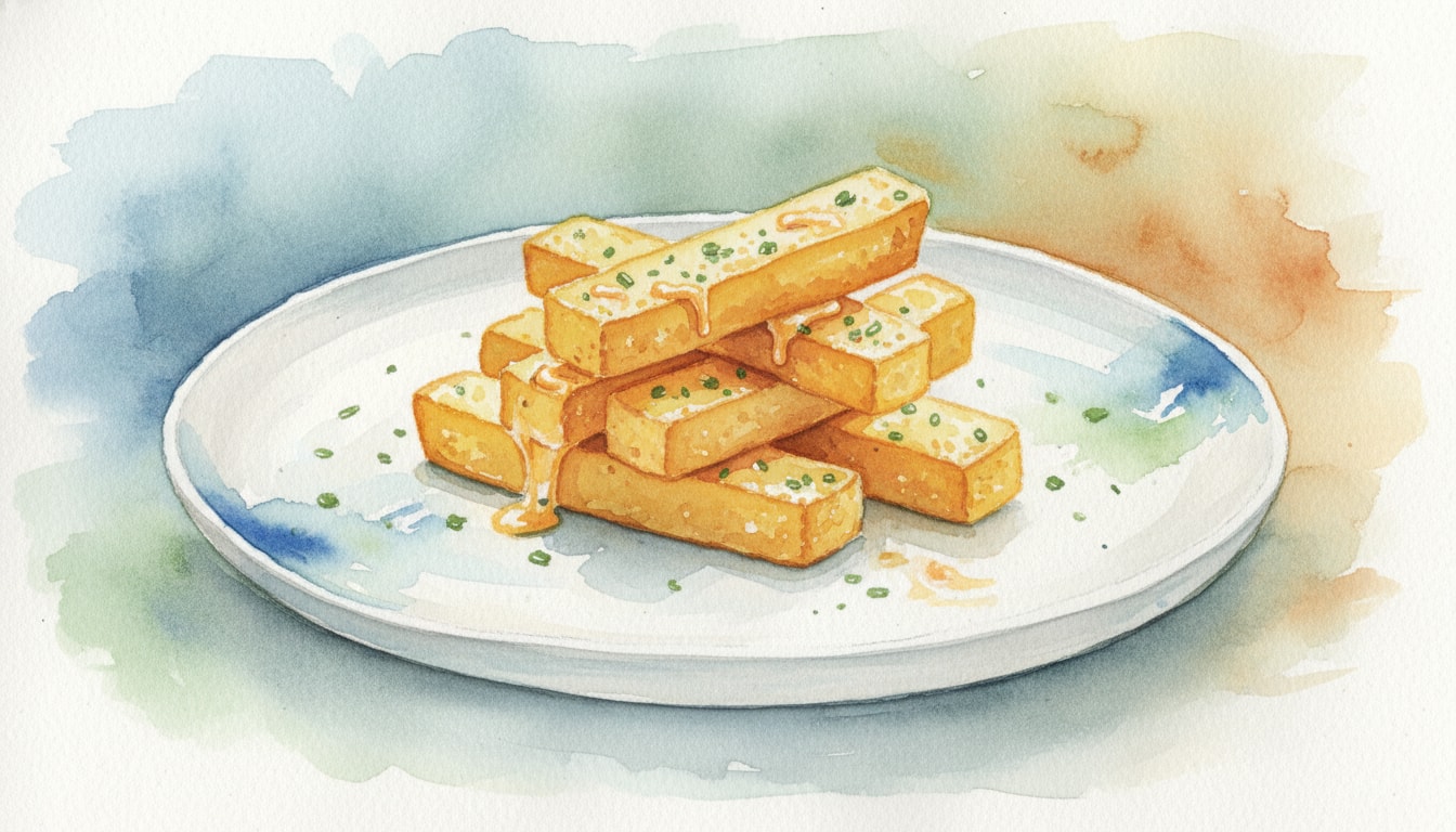 Once set, lift the polenta slab out using the parchment paper. Place on a cutting board and slice into uniform rectangular batons (approx. 2cm x 8cm). Pat dry with a paper towel to remove excess moisture.