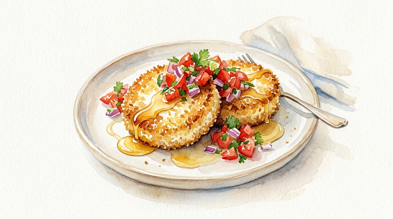 Spoon the fresh tomato salsa onto serving plates, top with the warm crispy goat cheese, and drizzle with honey just before serving.