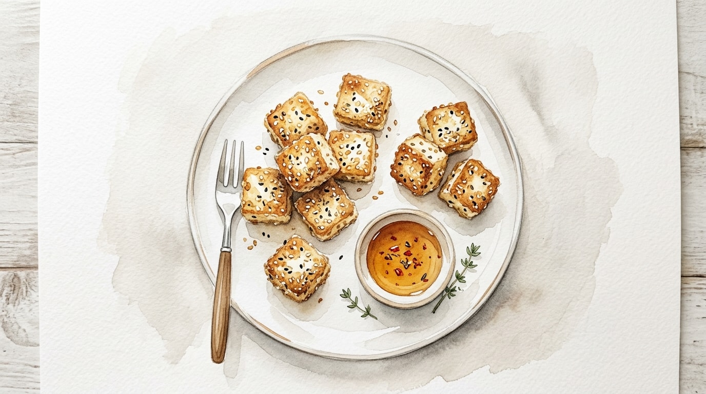 Add the coated feta cubes in a single layer. Pan-fry for 1 to 2 minutes per side at approximately 175 C / 350 F, turning gently with tongs, until the sesame seeds are toasted and the crust is golden brown and crispy.