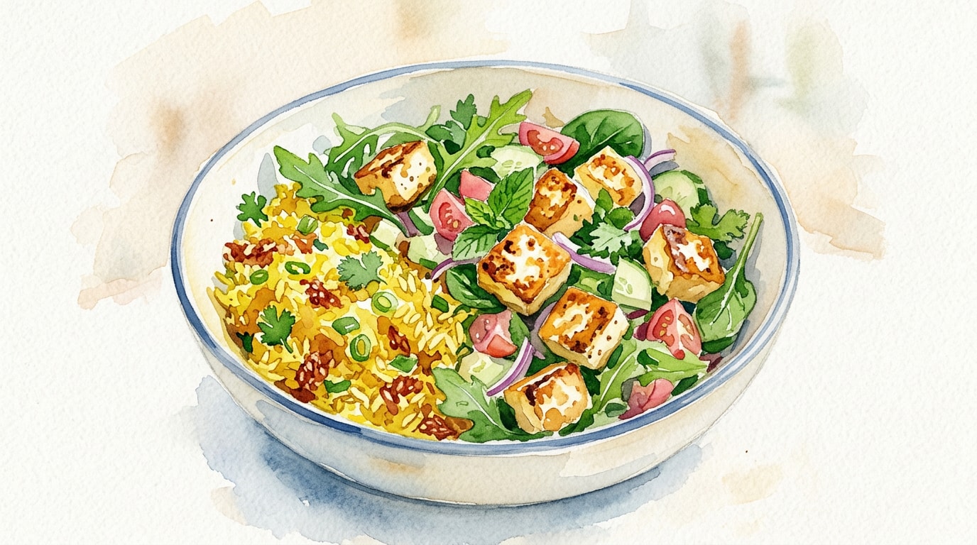 Immediately arrange the hot seared halloumi and chunks of crispy turmeric rice over the salad base. Drizzle generously with the ginger-lime vinaigrette and serve immediately.