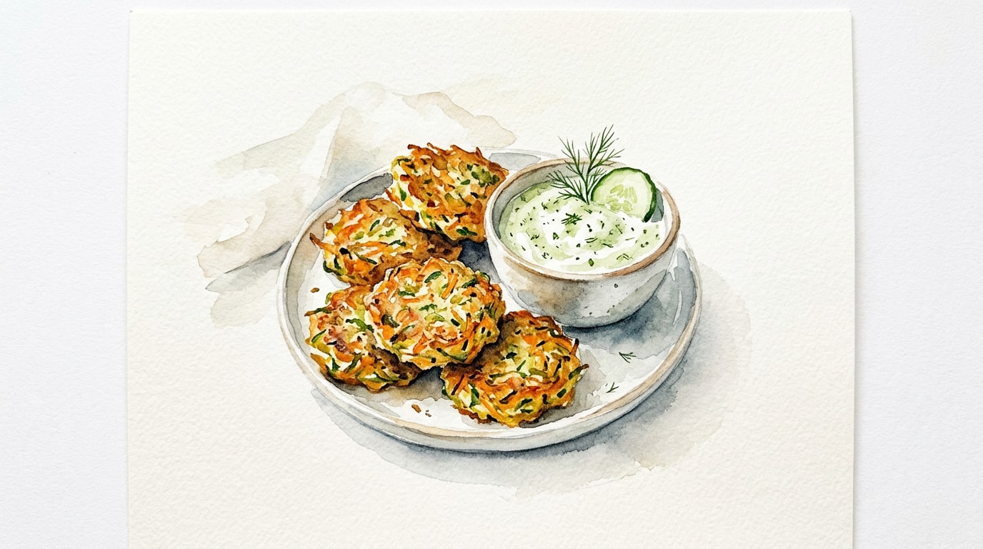 Transfer the cooked fritters to a plate lined with paper towels to absorb excess oil. Serve immediately while warm, accompanied by the chilled lemony cucumber dip.