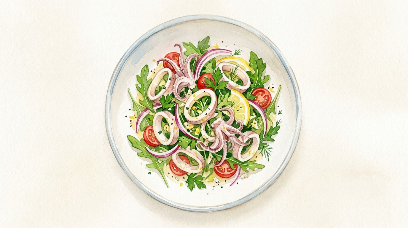 Drain the chilled squid thoroughly. Pat the rings and tentacles completely dry with paper towels to ensure the vinaigrette will adhere properly and not become watered down.