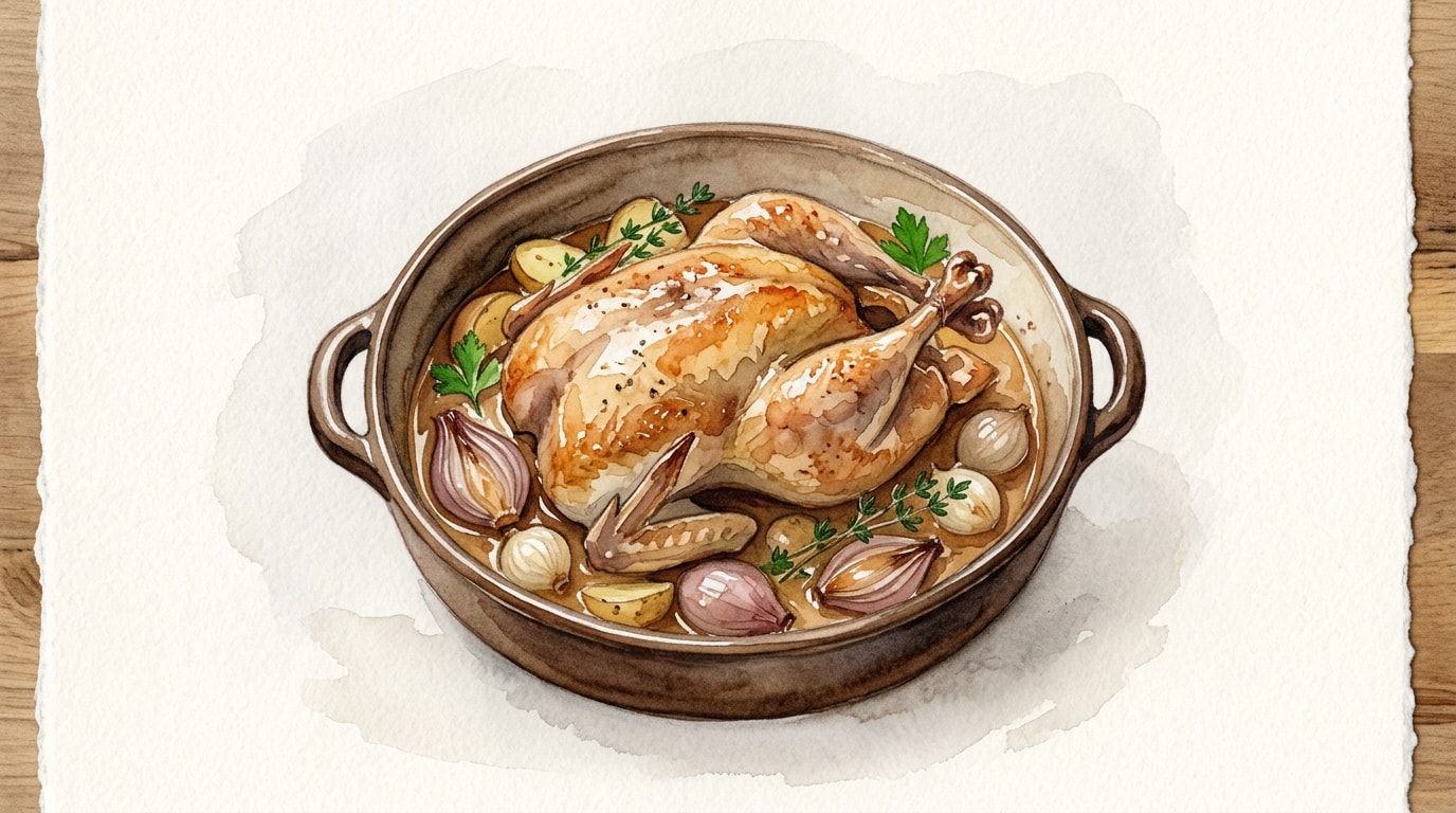 Return the seared guinea fowl, crispy pancetta, and fresh thyme sprigs to the pot. Pour the warm chicken stock around the bird. Bring the liquid to a gentle simmer, cover with the tight-fitting lid, and transfer to the preheated oven. Cook until the juices run clear and a meat thermometer inserted into the thickest part of the thigh reads 74C/165F.