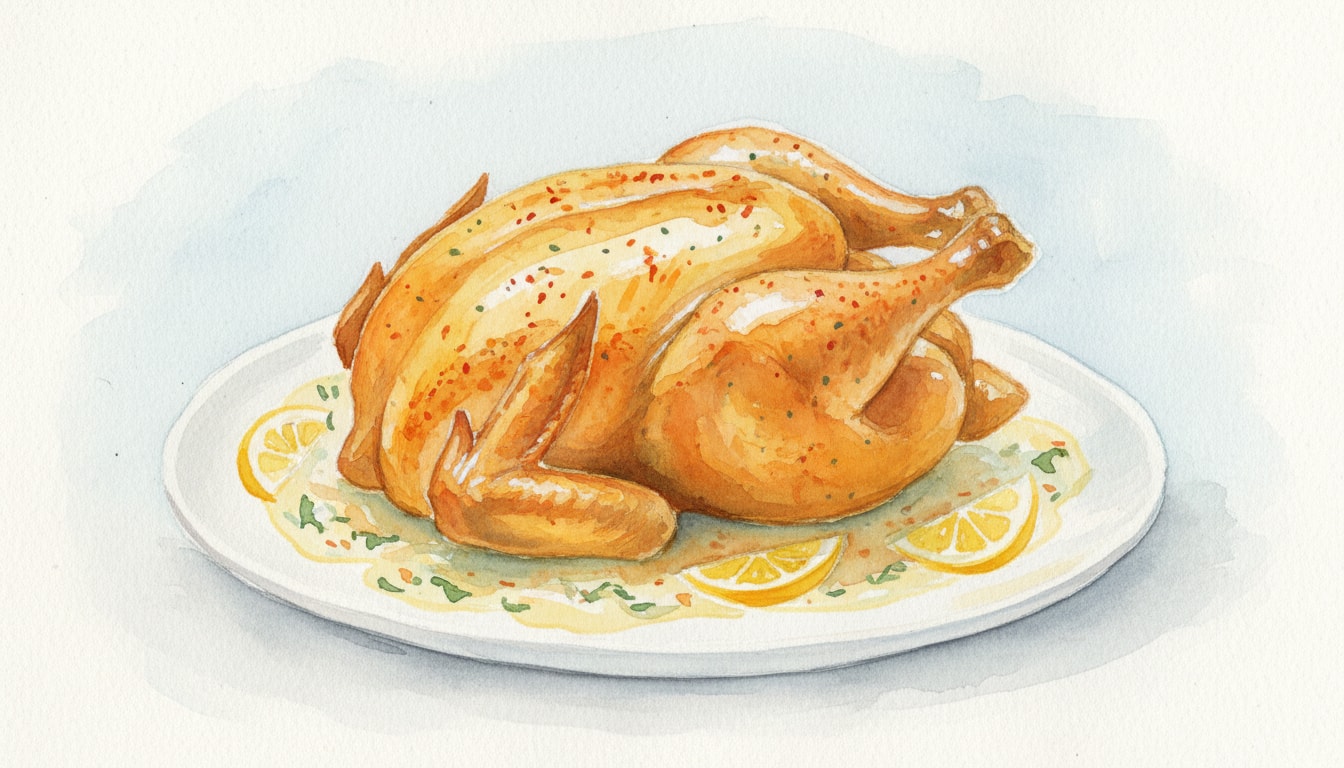 Roast for approximately 60 minutes. Rotate the pan halfway through if browning unevenly. The chicken is done when the skin is deeply brown and the internal temperature reaches 74°C (165°F) at the thickest part of the thigh.