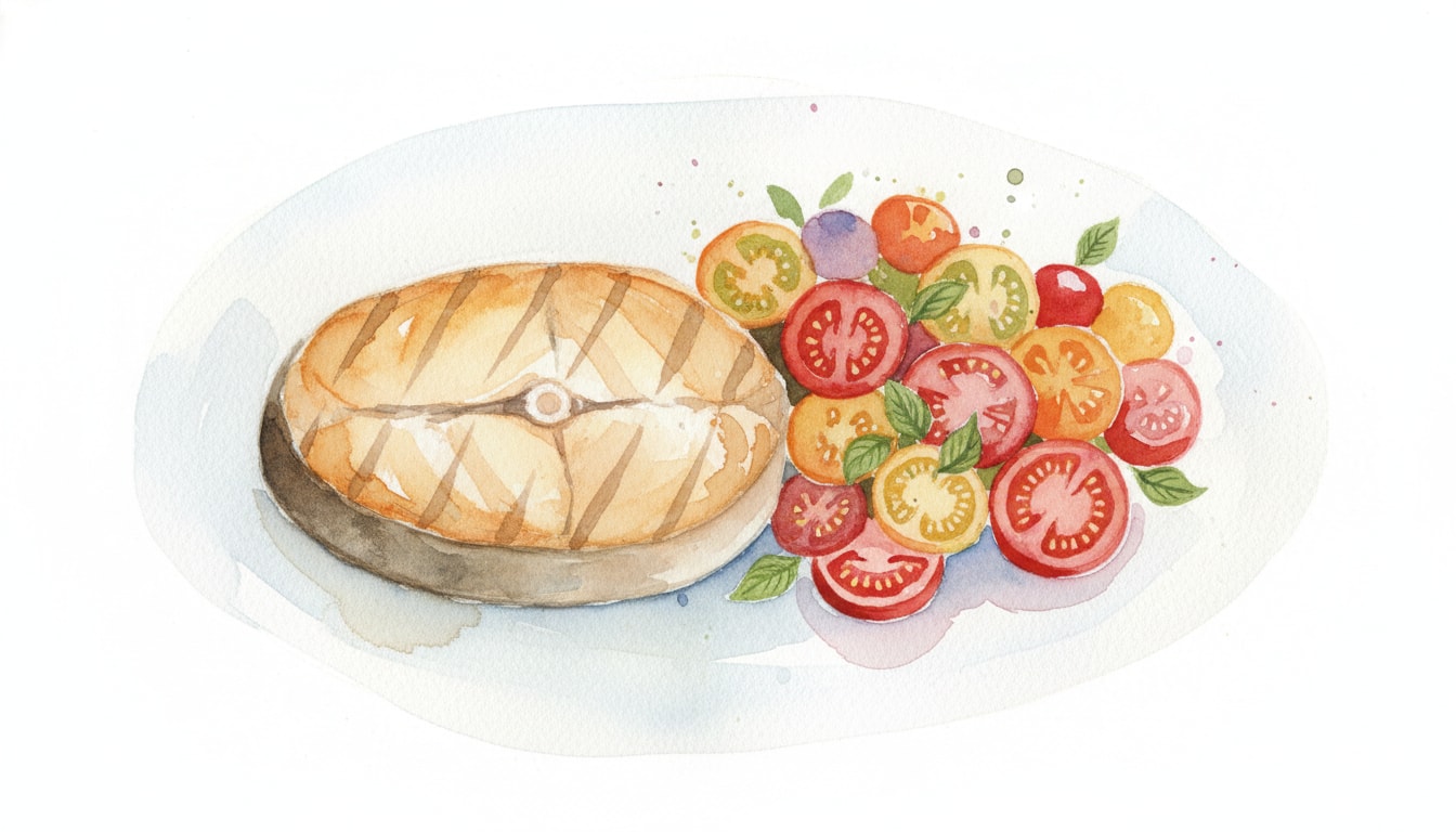 Transfer the fish to a plate and let rest for 3-5 minutes. Just before serving, toss the fresh torn basil into the tomato salad.