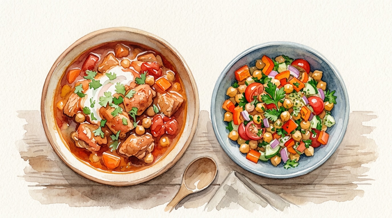 Ladle the hot harissa chicken stew into shallow bowls. Serve alongside a generous portion of the cool, vibrant chickpea salad.