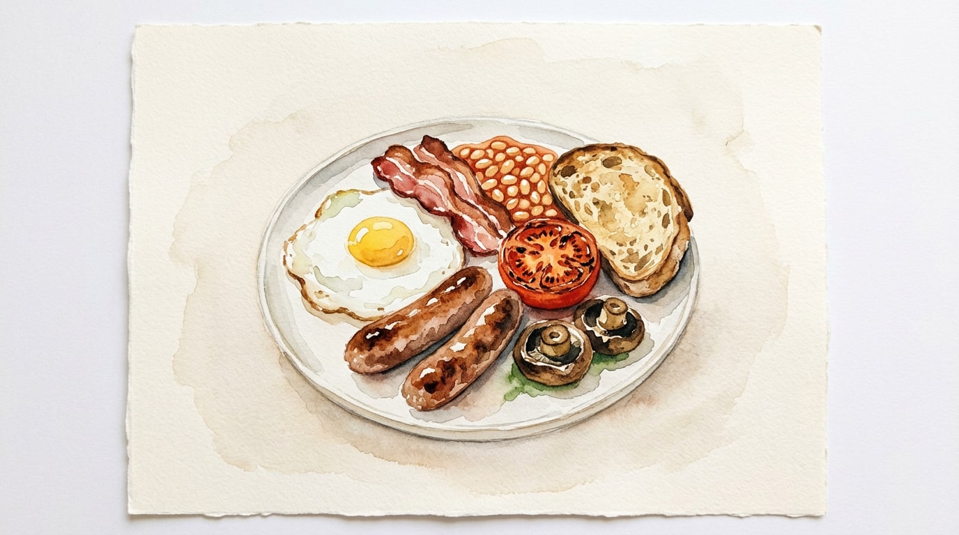 - Timing is the true test of a Full English Breakfast. Work linearly: sausages take the longest, followed by bacon. Beans can hold on lowest heat. Eggs and toast wait for nobody.