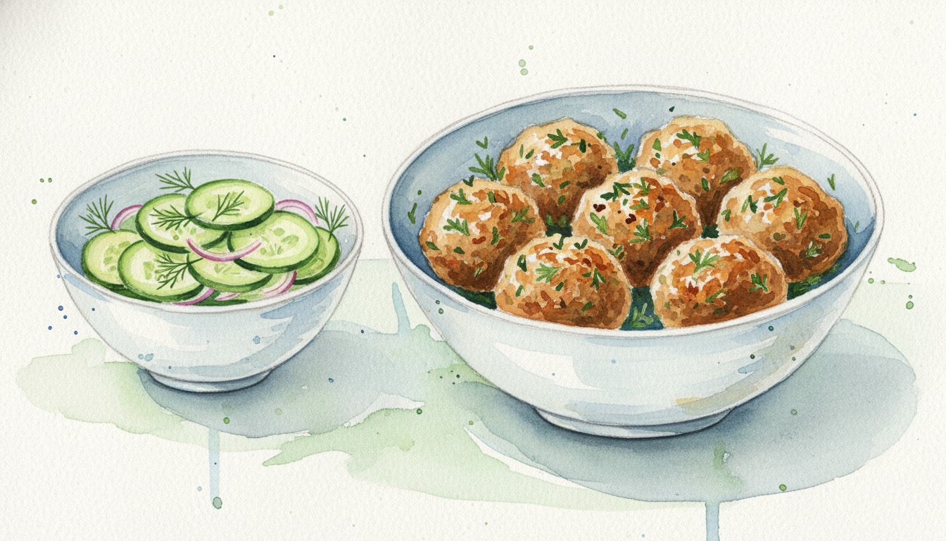 Drain the cucumber salad of excess liquid released during marinating. Serve the hot meatballs alongside the chilled salad.