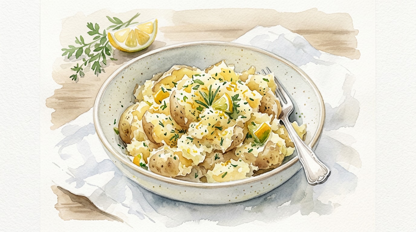 Add the chopped parsley, chives, and dill to the bowl. Gently fold the crushed potatoes, vinaigrette, and fresh herbs together until every piece is coated. Taste and adjust seasoning with additional salt or cracked pepper if needed. Serve warm or at room temperature.