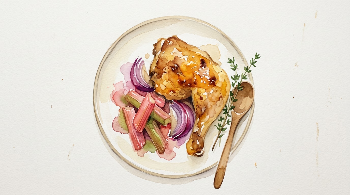 Remove the roasting pan from the oven. Let the chicken rest for 5 minutes in the pan before serving. Spoon the pan juices and savory rhubarb-onion sauce over the chicken.