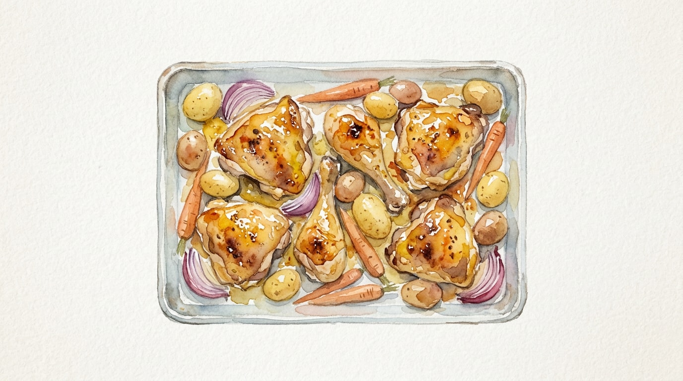 Remove from the oven and allow the chicken to rest on the baking sheet for 5 minutes before serving. This allows the juices to redistribute while the vegetables finish absorbing the caramelized pan drippings.