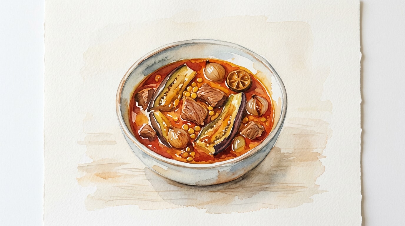 Once the beef is tender, gently nestle the fried eggplant slices into the simmering stew. Pour the bloomed saffron water over the top. Simmer uncovered for 30 minutes to allow the sauce to thicken and the eggplants to absorb the rich broth.