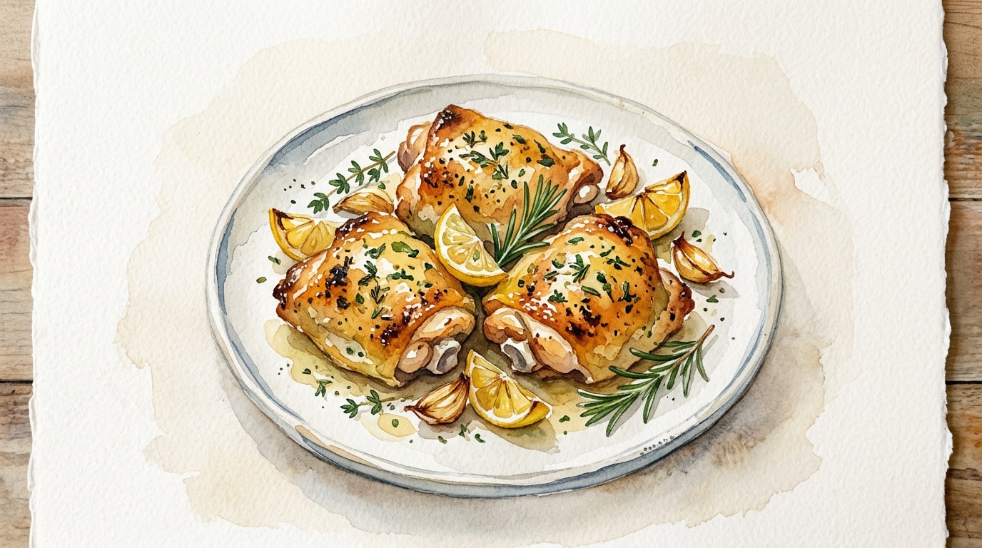 Place the seasoned chicken thighs skin-side up in a cast iron skillet or roasting pan. Pour the lemon juice into the bottom of the pan, avoiding pouring it over the skin to keep it dry.
