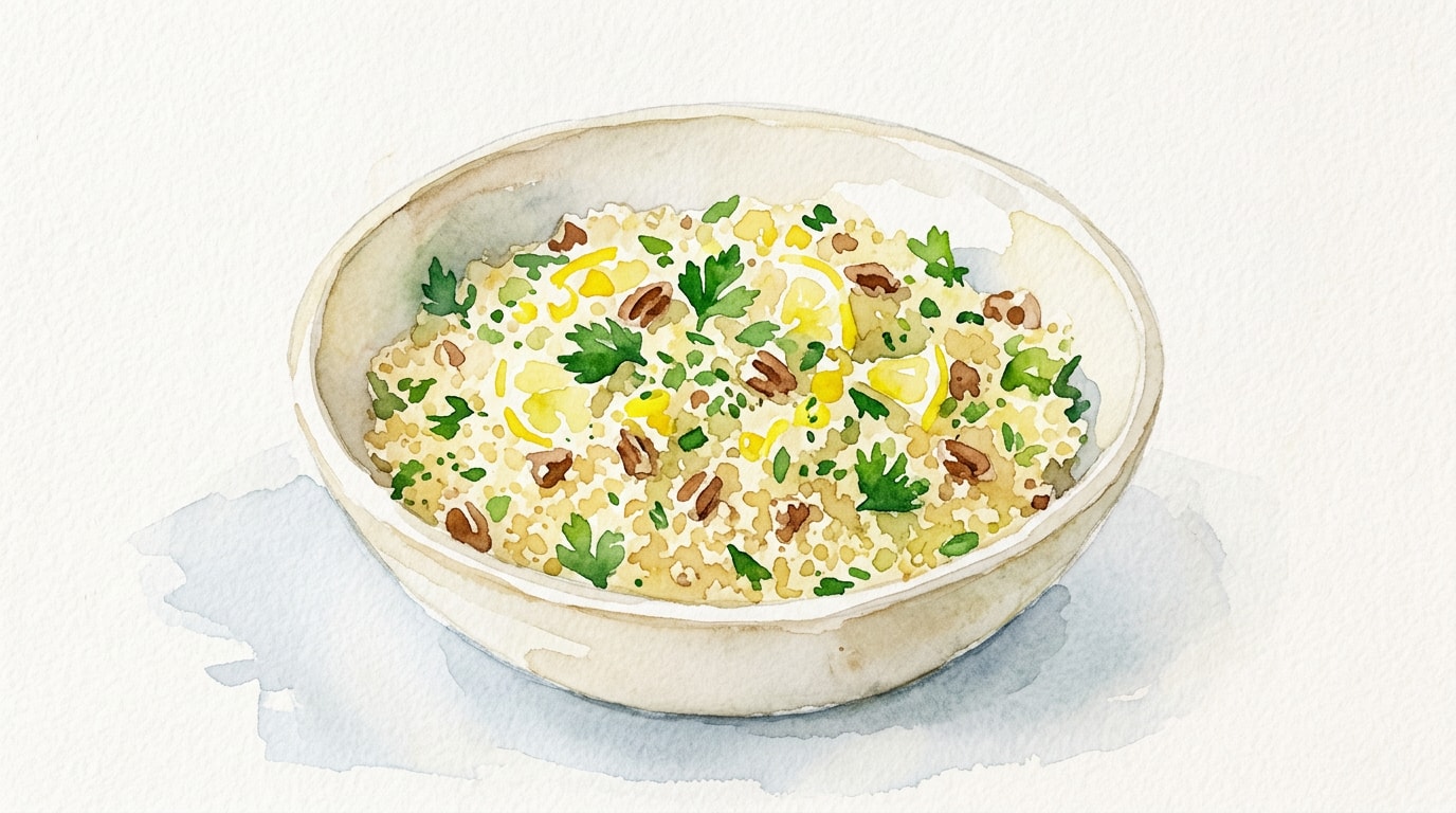 Fold the toasted pecans, lemon zest, lemon juice, chopped parsley, and black pepper into the fluffed couscous. Taste for seasoning, adding more salt or lemon juice if desired. Serve warm or at room temperature.