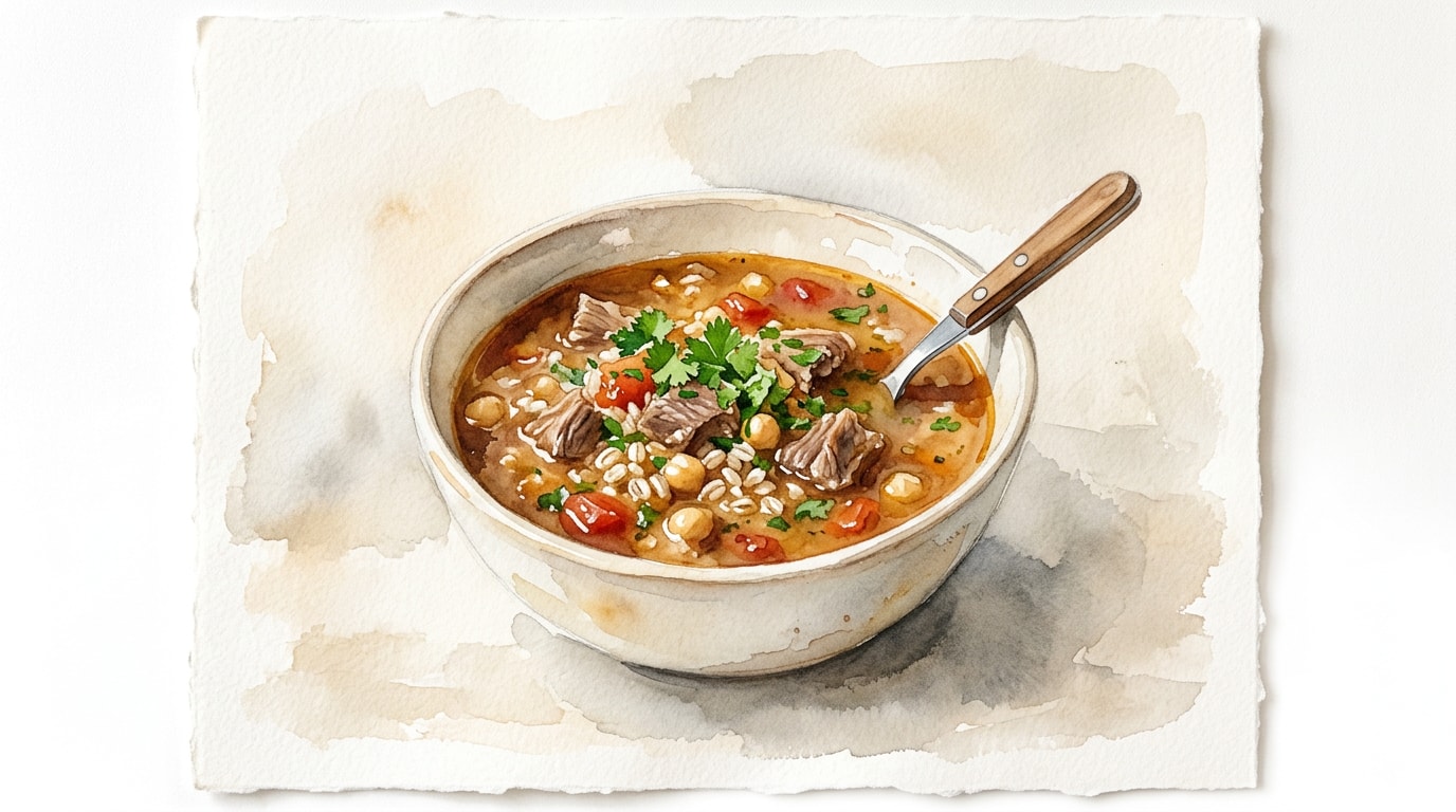 Stir the rinsed pearl barley and chickpeas into the soup. Cover and continue to simmer until the lamb is fall-apart tender (reaching an internal temperature well above 74°C/165°F for stewed meats) and the barley is completely cooked and tender.