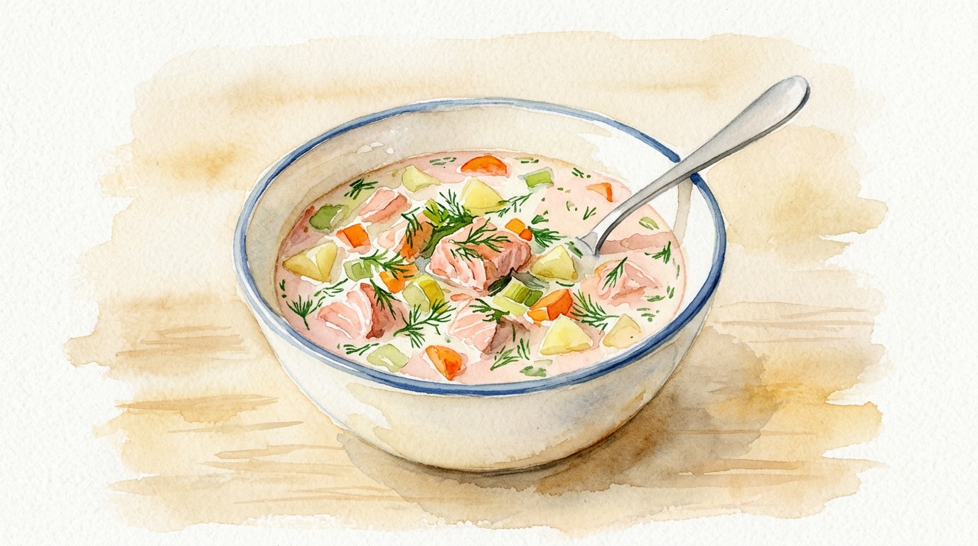 Ladle the warm soup into bowls, ensuring an even distribution of broth, root vegetables, and salmon chunks. Garnish with additional fresh dill sprigs.