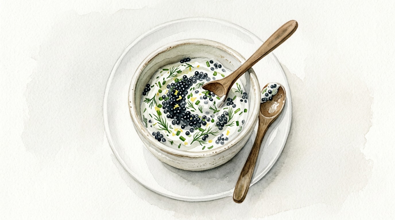 - Substituting standard sour cream with Greek yogurt adds a boost of protein and lowers the fat content, while still providing the necessary acidic tang to cut through the richness of the egg and caviar.