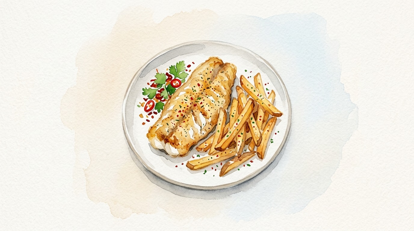 Serve the sizzling salt and chili fries immediately alongside the spiced crispy cod.