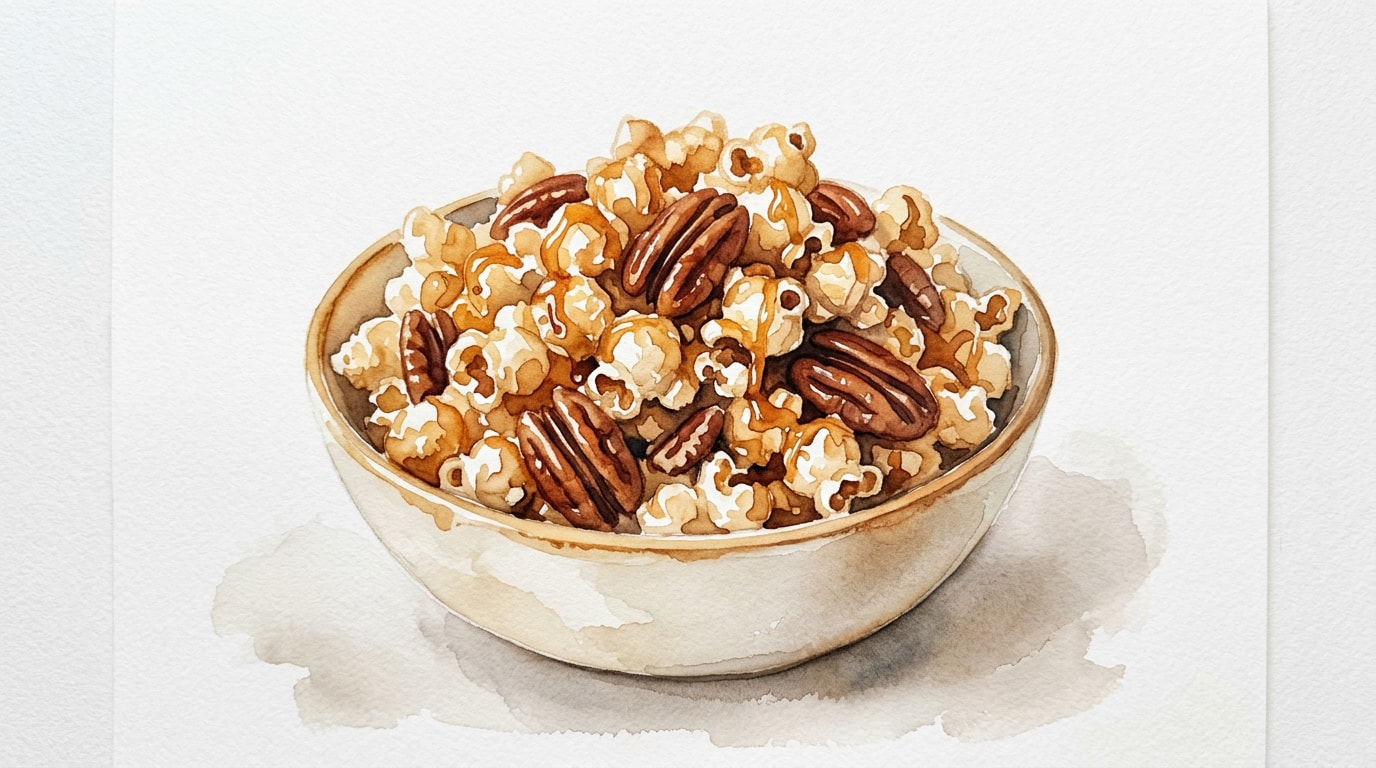 Quickly pour the foaming hot caramel over the popcorn and pecans in the mixing bowl. Toss vigorously with the silicone spatula until the mixture is evenly coated. Work fast before the caramel begins to set.