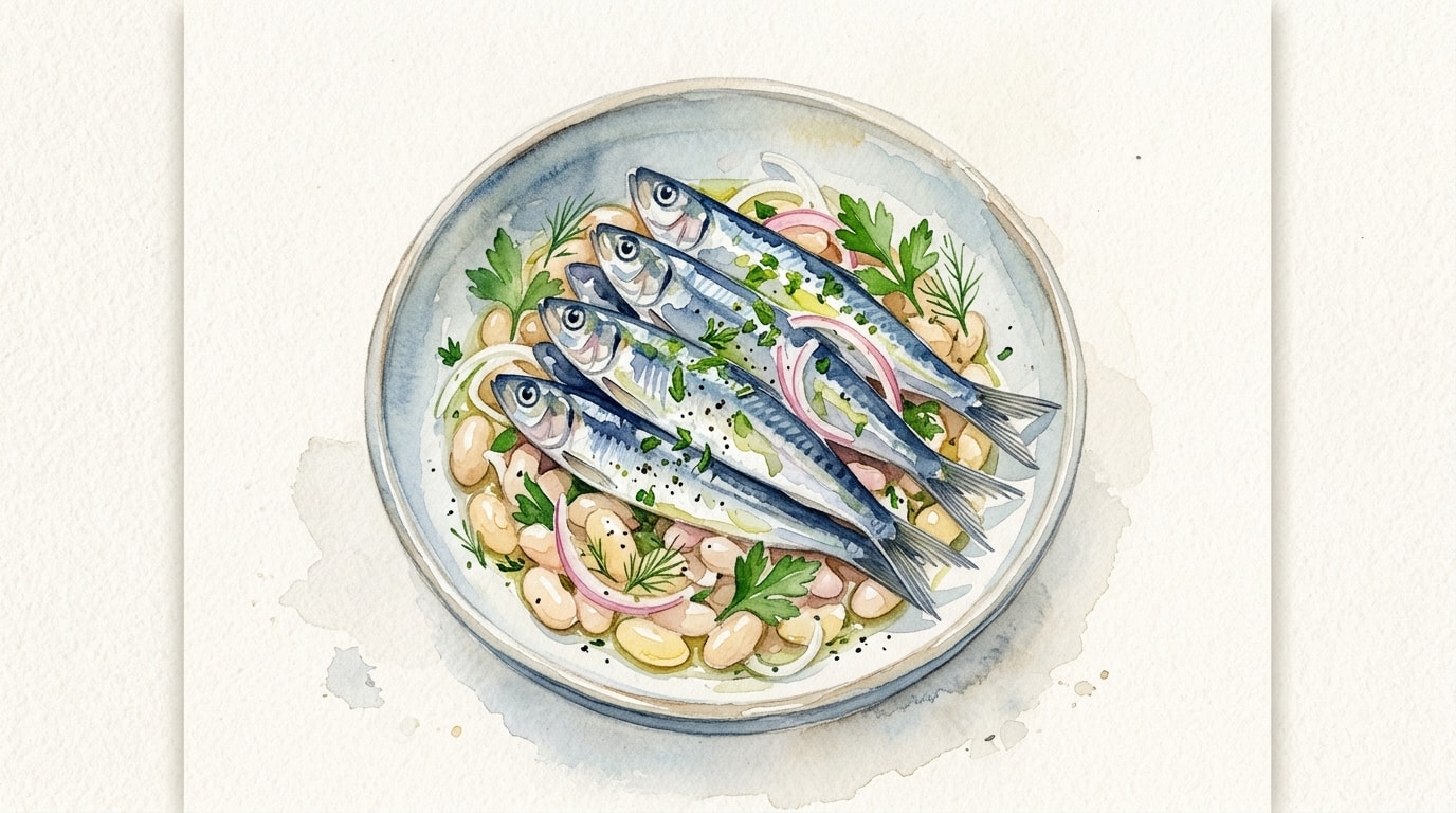 To serve, spread an even layer of the pickled white beans onto a serving platter. Lift the sardine fillets from their marinade, allowing excess liquid to drain off, and arrange them decoratively over the beans. Serve immediately.