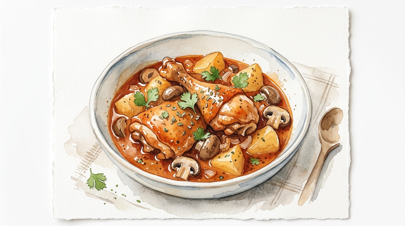 Add the halved mushrooms and baby potatoes to the residual chicken fat in the pot. Sauté until the mushrooms release their moisture and begin to brown on the edges.