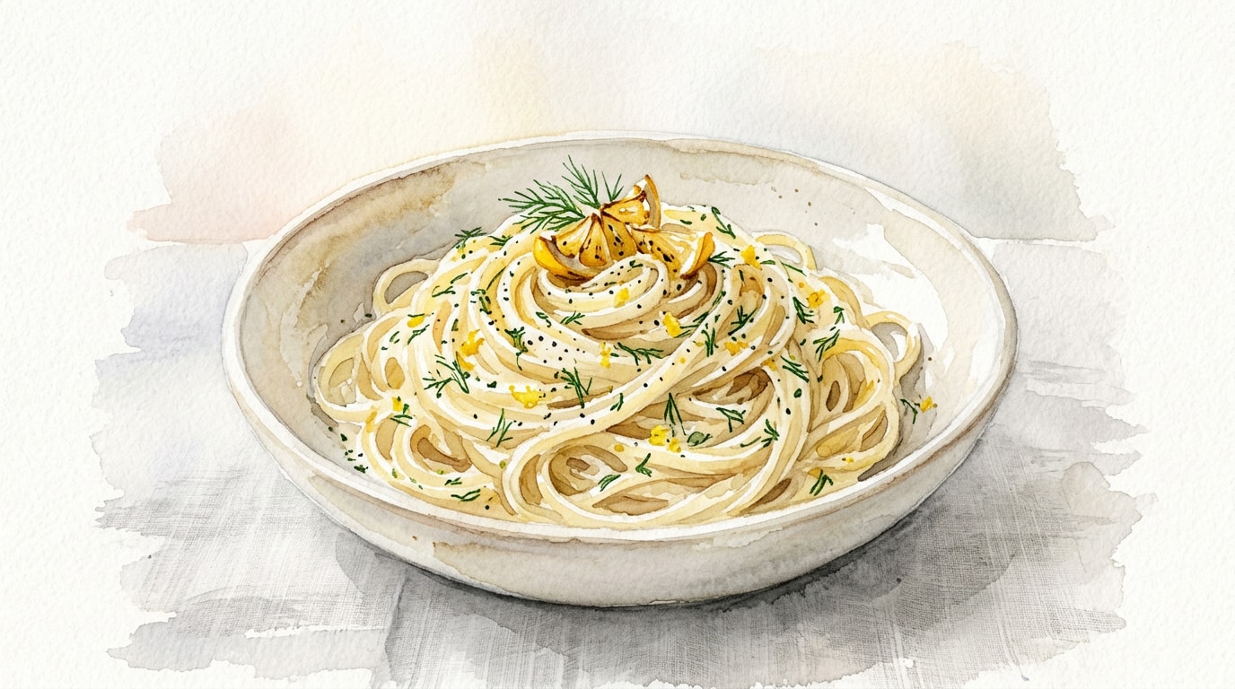 Add the drained linguine, chopped Meyer lemon flesh, and chopped fresh dill to the simmering cream sauce. Toss vigorously to combine, adding splashes of the reserved hot pasta water as needed until the sauce emulsifies and clings tightly to the noodles.
