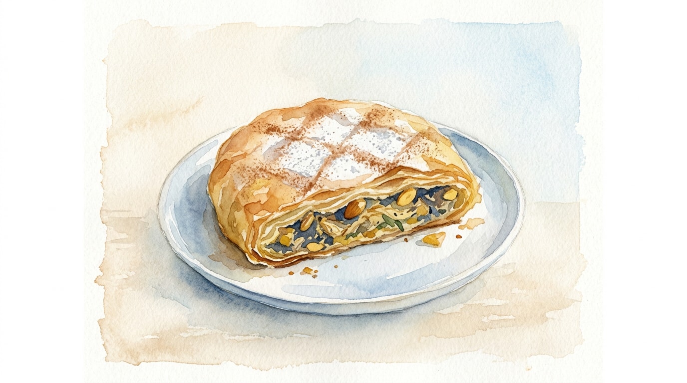 Bake in the preheated oven for 35 to 40 minutes until the bastilla is deeply golden, crisp, and heated all the way through. If the top browns too quickly, tent loosely with aluminum foil for the final 15 minutes.