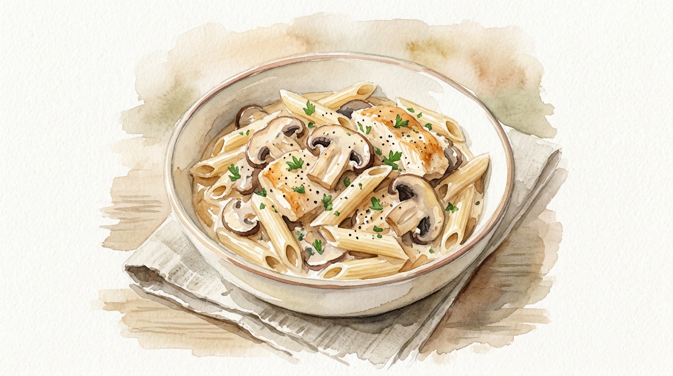 Add the sliced mushrooms and diced onion to the chicken, cooking until the vegetables soften and release their moisture.