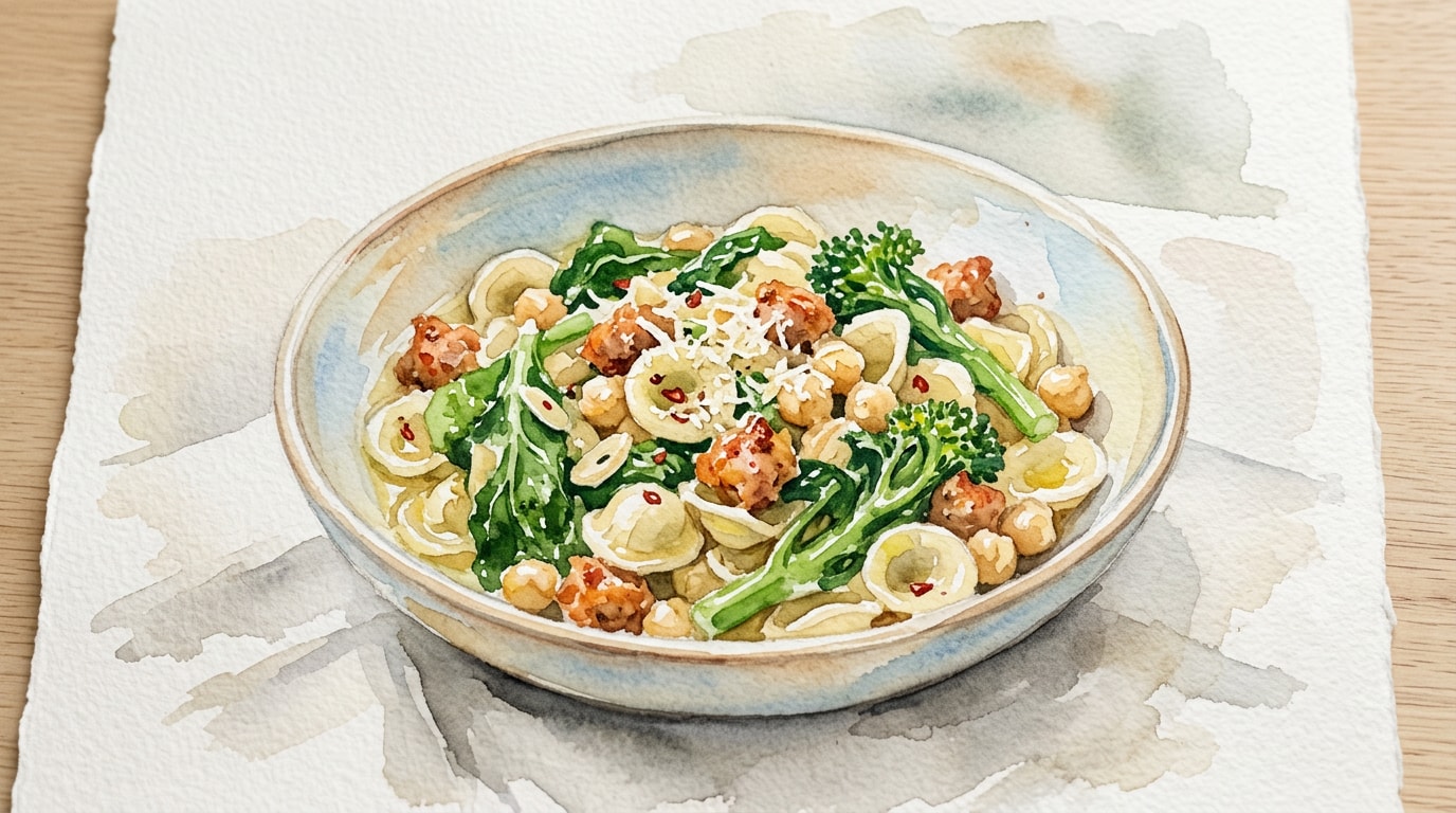 - Orecchiette translates to little ears in Italian. It is the absolute ideal shape for this dish because the cupped centers perfectly cradle the whole chickpeas, sausage crumbles, and the rich butter sauce.